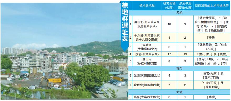 這批棕地有5幅位於元朗、2組在屯門及1組在大埔。元朗涉及的5幅土地共佔地49公頃。其中,2幅面積較大的地塊,1幅位於元朗屏山、朗天路以東及庸園路以西,佔地約18公頃,現為綜合發展區、住宅及綠化帶等用途。另1幅位於元朗沙埔、新潭路以東,面積17公頃,當中13公頃為棕地。現為「工業(丁類)」及「農業用途」。2幅屯門棕地位於泥圍及藍地北,分別佔地5公頃及7公頃,現為住宅用途。大埔區棕地位於泰亨,佔地約3公頃,現為農地。