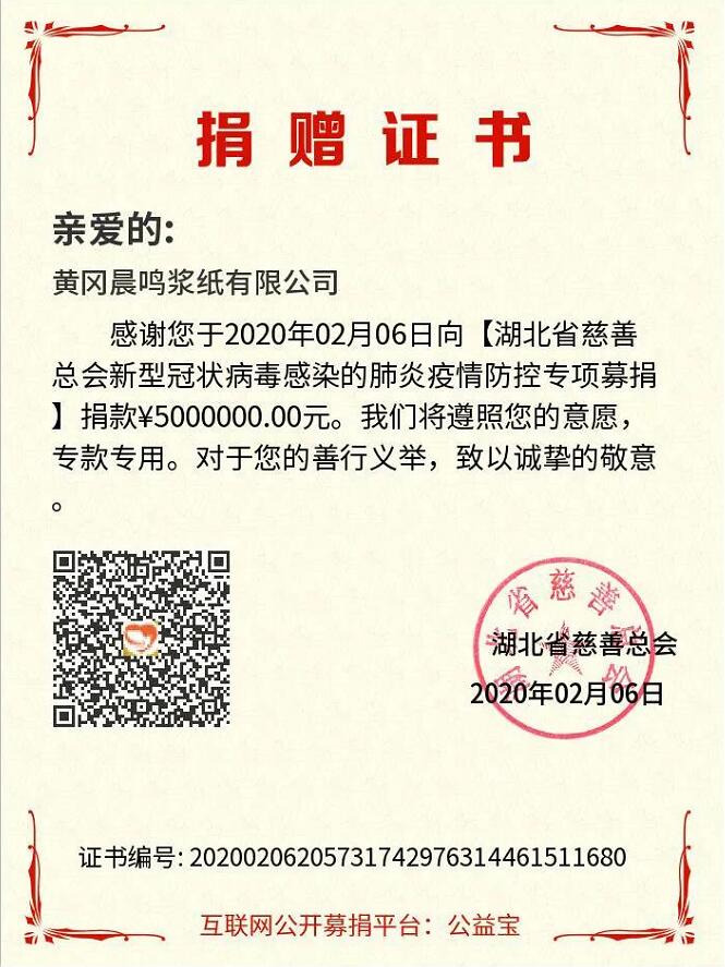 【香港商报网讯】记者邓建乐报道:近日,记者获悉,在全国同心抗击新冠病毒疫情中,山东晨鸣纸业集团股份有限公司(简称晨鸣纸业,01812.HK,000488.SZ)的一系列表现颇有龙头民族造纸企业的社会责任和担当,该集团现已累计捐款捐物1340余万元。