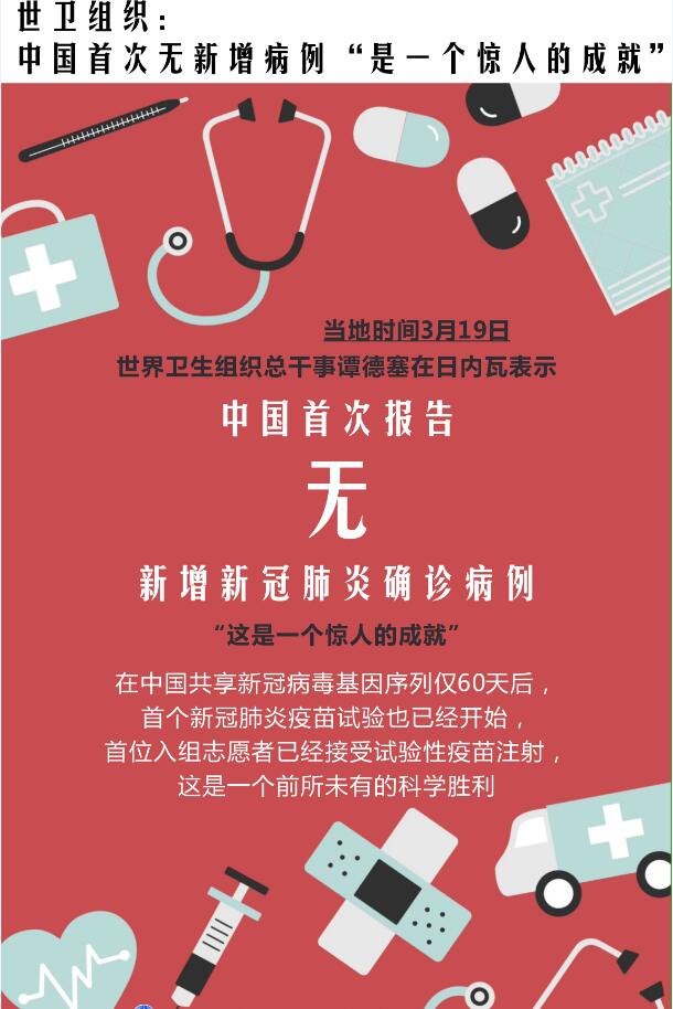 譚德塞當天在例行疫情簡報會上說,目前全球新冠肺炎確診病例超過20萬例,死亡病例超過8000例,但中國首次報告無新增確診病例,「這是一個驚人的成就」。他表示,在中國共享新冠病毒基因序列僅60天後,首個新冠肺炎疫苗試驗也已經開始,首位入組志願者已經接受試驗性疫苗注射,這是一個前所未有的科學勝利。