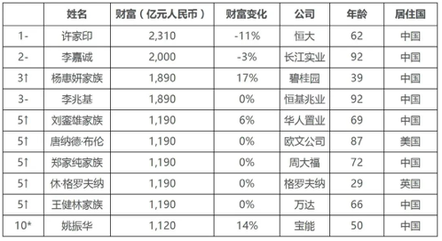 3月20日,胡润研究院发布2020年全球房地产富豪榜,62岁的许家印以2310亿元财富蝉联全球房地产首富,92岁的李嘉诚以2000亿元位列第二,杨惠妍及其家族以1890亿元位列第三,王健林家族以1190亿元财富位列第五,前十名中八位都是中国人。特朗普以210亿人民币位列全球地产企业家第86位,比去年下降4位。