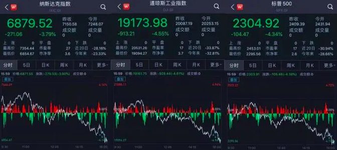 美东时间周五,美股尾盘跳水,道指收跌逾900点,纳指收跌3.8%,标普500收跌4.34%。迪士尼、3M跌超9%,领跌道指,苹果跌超6%。三大股指单周跌幅均创2008年金融危机以来最大,道指跌17.3%,纳指跌12.64%,标普500指数跌14.98%。