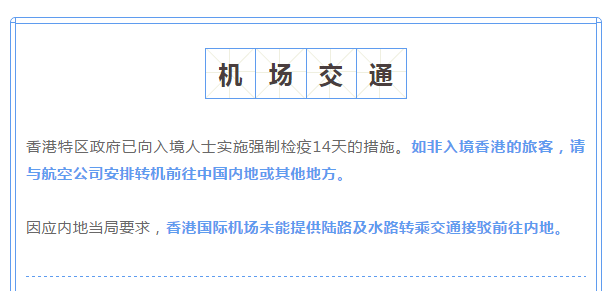 香港特区政府已向入境人士实施强制检疫14天的措施。如非入境香港的旅客,请与航空公司安排转机前往中国内地或其他地方。