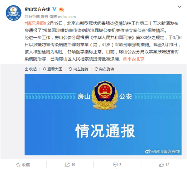 经进一步工作,房山公安分局根据《中华人民共和国刑法》第330条之规定,于3月6日以涉嫌妨害传染病防治罪对常某(男,41岁)采取刑事强制措施。截至3月20日,该人核酸检测为阴性,各项医学指标正常。目前,房山公安分局以常某涉嫌妨害传染病防治罪,已向房山区人民检察院提请批准逮捕。