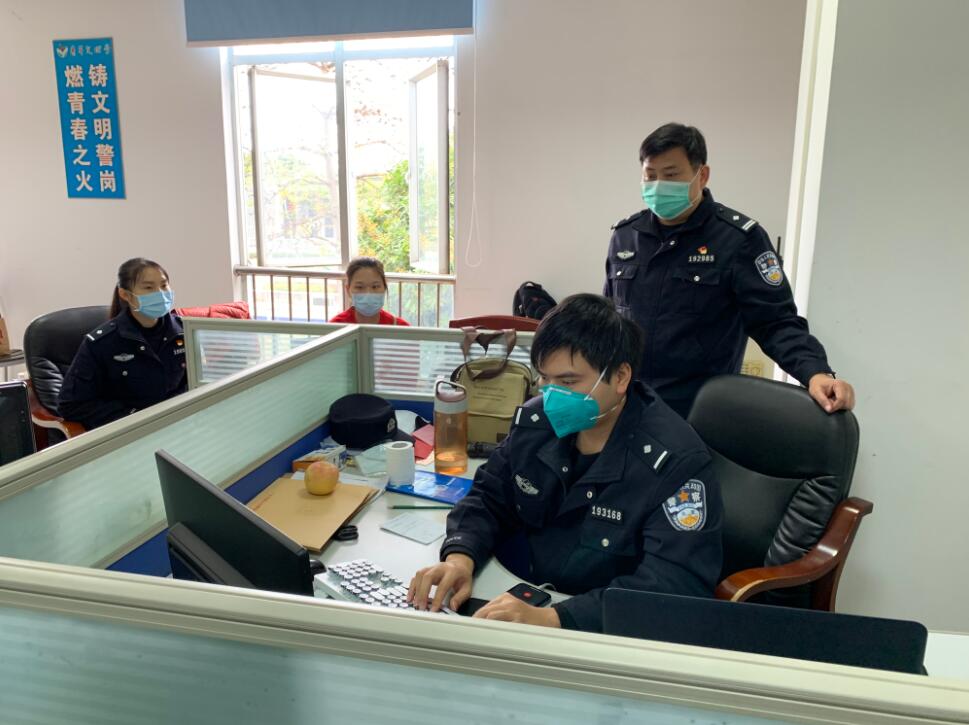佛山市順德區公安局北滘派出所刑警中隊副中隊長何兆倫(右一)與同事共同奮戰對口罩詐騙案件線索調查取證