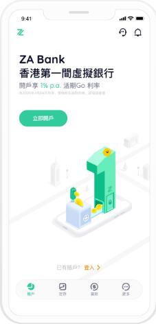 ZABank昨日正式開業推出「零門檻」的活期存款產品「ZA活期Go」,無論起存額多少,用戶均可享受1厘的活期高息。此利率適用於50萬元或以下的存款額,超出上限部分將按基本活期存款利率計算。以50萬元為例,假設年利率為1厘,一年可賺取5000.23元的利息,較市場基本存款利率0.001厘所提供的港元利息高1000倍。