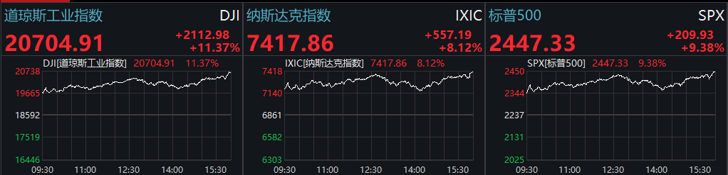 截至收盤,道瓊斯工業平均指數收報20704.91點,大漲2113點,漲幅11.37%,創下了1933年以來單日百分比漲幅最高的記錄,也是该指数有史以来最大的点数涨幅,道指也重新回到了20000點。標準普爾500指數報收2447.33點,漲幅9.38%;以科技股为主的納斯達克指數報收7417.86點,漲幅8.12%。這三個指數仍較2月中旬的高點下跌了至少24%。