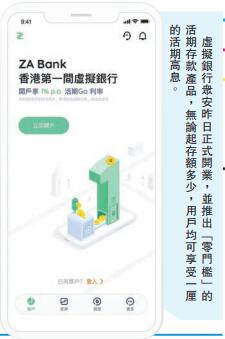 虛擬銀行眾安昨日正式開業,並推出「零門檻」的活期存款產品,無論起存額多少,用戶均可享受一厘的活期高息。