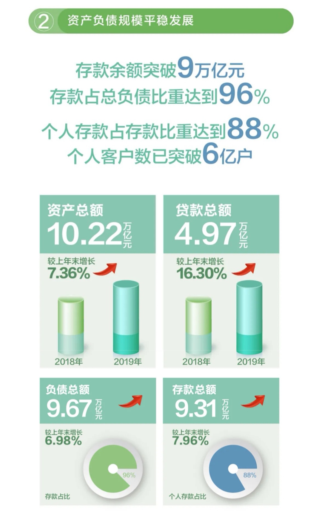 同时,邮储银行不断巩固核心负债优势,存款结构持续优化。数据显示,截至2019年末,邮储银行存款余额为9.31万亿元,其中个人存款余额8.18万亿元,较上年末增长9.58%;存款占总负债比重达到96%,个人存款占存款比重近88%。