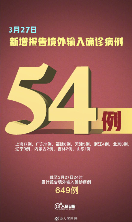 3月27日0—24时,中国31个省(自治区、直辖市)和新疆生产建设兵团报告新增确诊病例54例,均为境外输入病例;新增死亡病例3例(湖北3例);新增疑似病例29例。