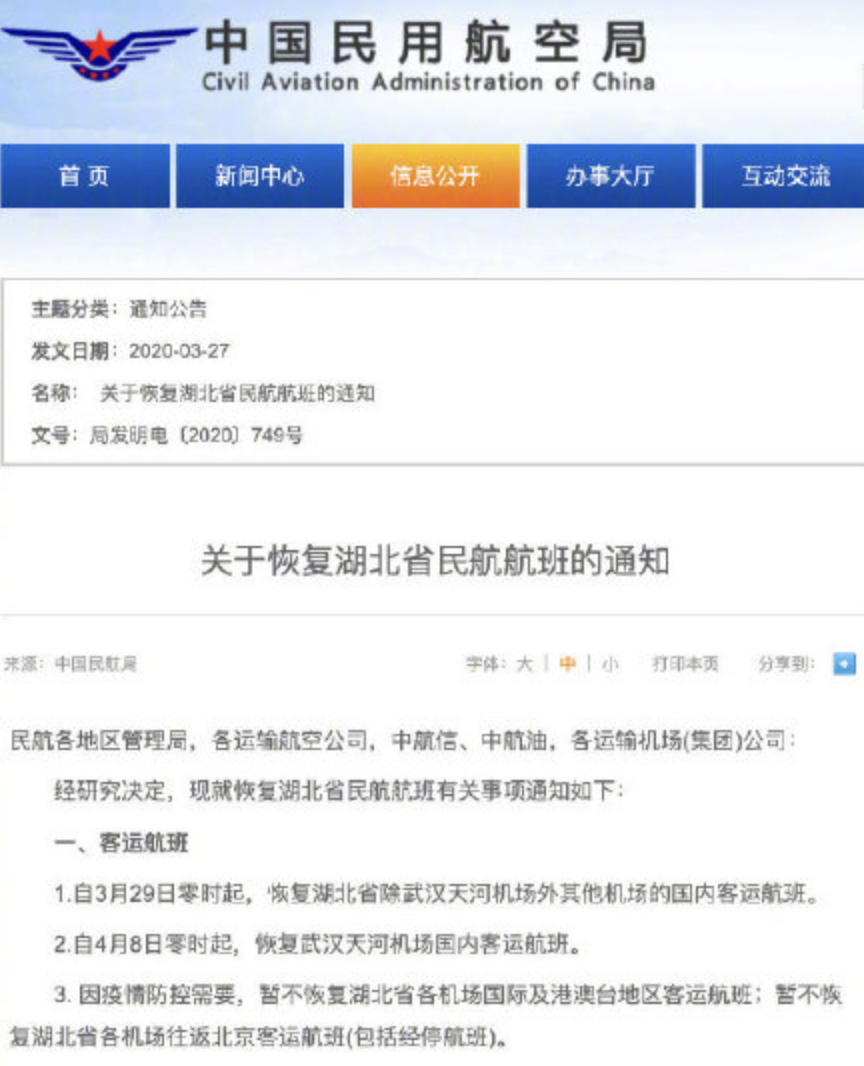 据民航局网站消息,3月27日,民航局发布通告,自3月29日零时起,恢复湖北省除武汉天河机场外其他机场的国内客运航班;自4月8日零时起,恢复武汉天河机场国内客运航班。