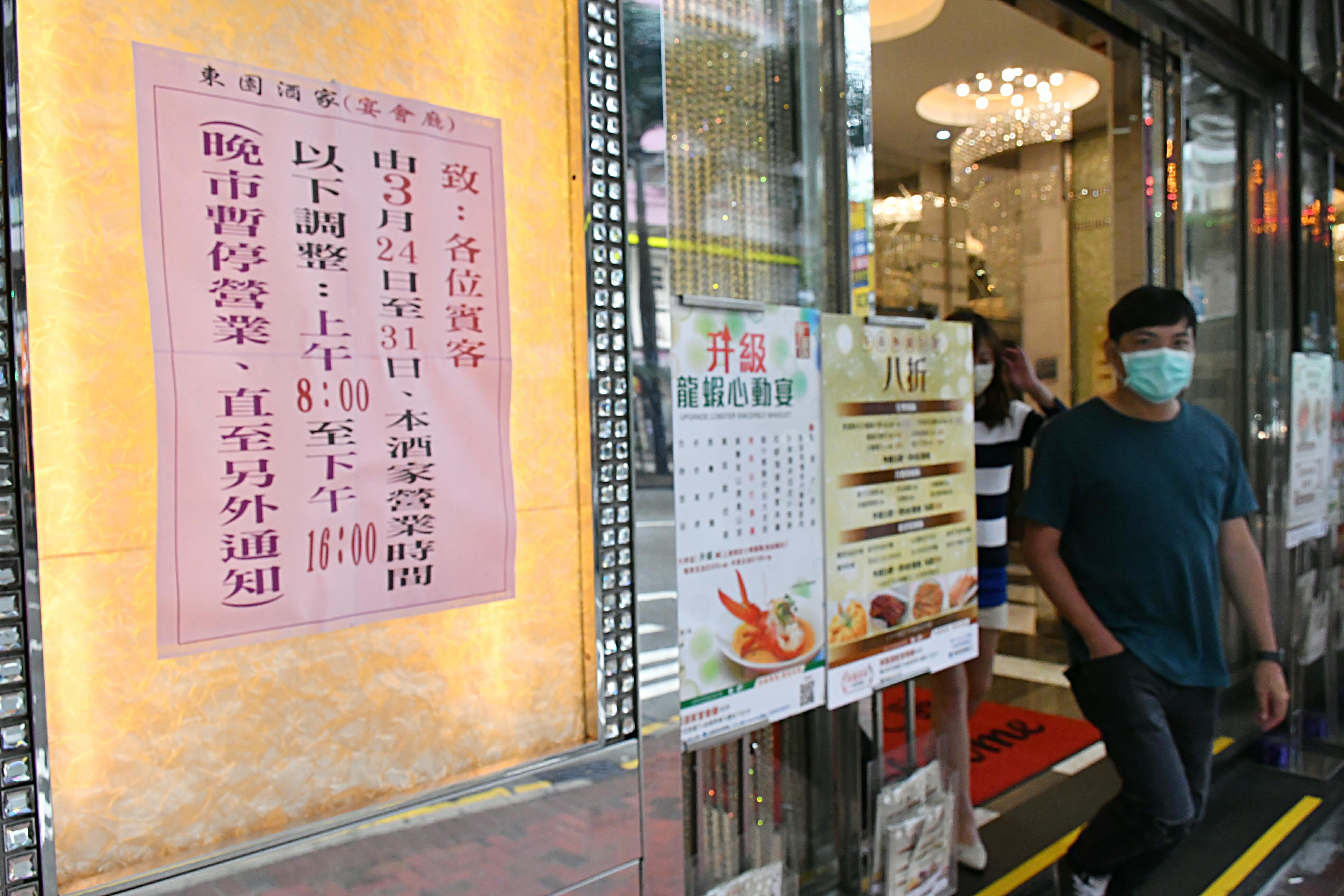 深水埗南昌咖啡麵是一間700呎地舖,本身有8張枱,其中4張已放上「停用」紙牌,股東鄧永明早已買好消毒酒精、探熱槍,並張貼告示「客人必須量體溫和戴口罩」。他坦言,「少了一半枱,即使爆滿都要蝕錢,政府給我們的8萬元一次過補助,剛好夠填過去3個月所蝕的錢。現在我們已不再請兼職,長工要輪流放無薪假,3個股東都要落場由朝六做到晚九。」