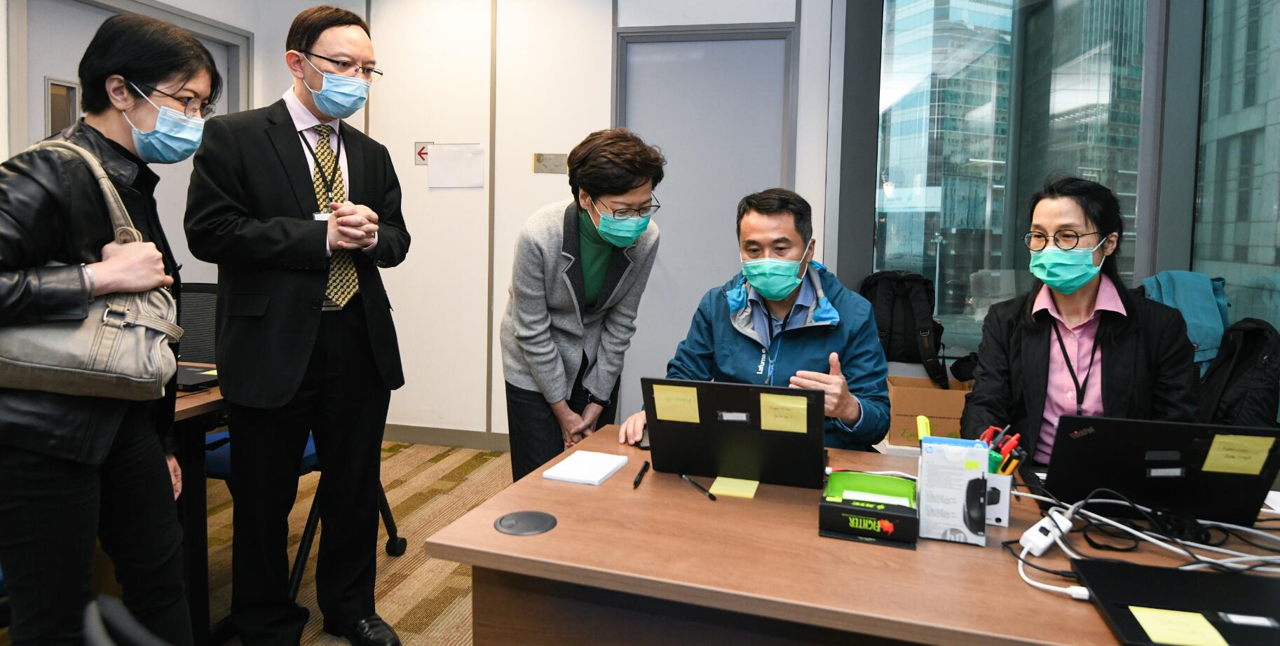 林鄭月娥與工作人員交談,知悉除資科辦人員外,有不少來自廉政公署的人員亦在該中心參與監察工作。她對各公職人員為協助抗疫而主動擔負起日常工作以外的任務表示充分肯定,正好體現全政府同心抗疫的承擔。