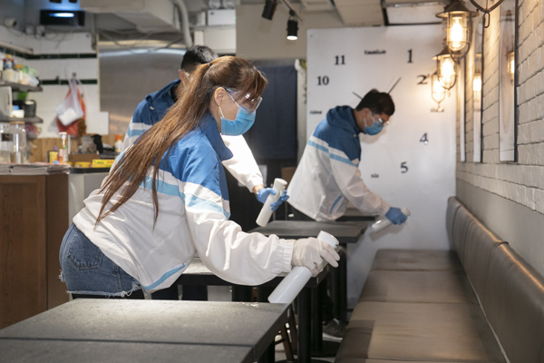 煤氣公司義工為食肆噴塗納米光觸媒消毒劑。