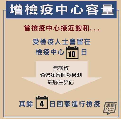 【香港商报網訊】特區政府昨晚在Facebook專頁「添馬台」指,政府會密切留意檢疫中心的入住率,當接近飽和時,會實行專家的建議,即受檢疫者在入住檢疫中心 10 天後,如無病徵,深喉唾液檢測確定沒受感染,經醫生評估亦認為條件合適,才可回家完成餘下 4 天的檢疫。