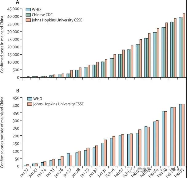 柳叶刀的文章对比了约翰·霍普金斯大学系统科学与工程中心(CSSE),世界卫生组织(WHO)以及中国疾病控制与预防中心(Chinese CDC)的数据报告。