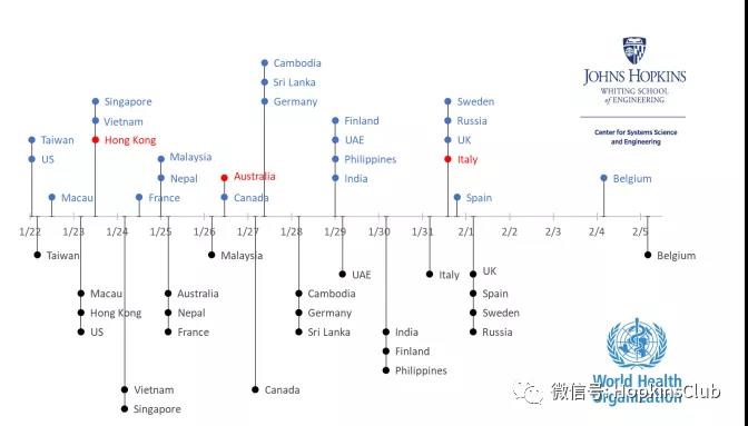除澳大利亚,香港和意大利外,约翰·霍普金斯大学的CSSE在世界卫生组织之前报告了新感染的国家,而在相应的世界卫生组织情况报告以后的几个小时内就报告了香港和意大利。