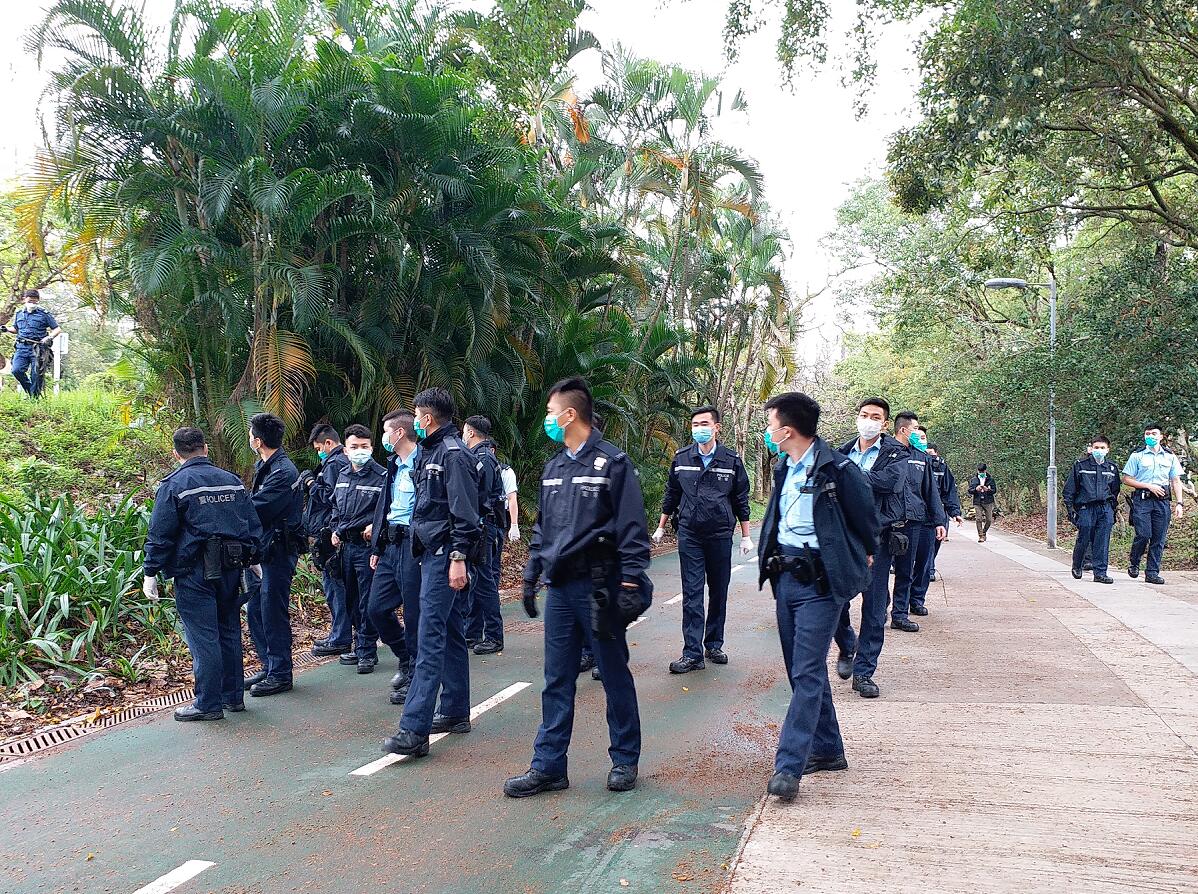 約 50 名警員昨晨 在 大 埔 警 署 附 近 搜 證。 記者 區天海攝