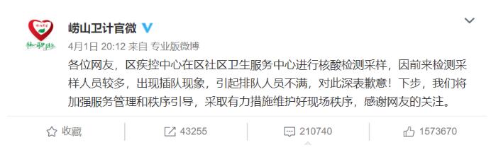 当天晚间,青岛市崂山区卫生局@崂山卫计官微 回应称:区疾控中心在区社区卫生服务中心进行核酸检测采样,因前来检测采样人员较多,出现插队现象,引起排队人员不满,对此深表歉意!下步,我们将加强服务管理和秩序引导,采取有力措施维护好现场秩序,感谢网友的关注。