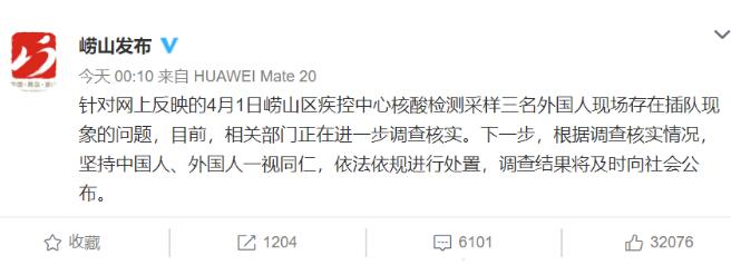 4月2日凌晨,青岛市崂山区人民政府新闻办公室@崂山发布 回应称:针对网上反映的4月1日崂山区疾控中心核酸检测采样三名外国人现场存在插队现象的问题,目前,相关部门正在进一步调查核实。下一步,根据调查核实情况,坚持中国人、外国人一视同仁,依法依规进行处置,调查结果将及时向社会公布。