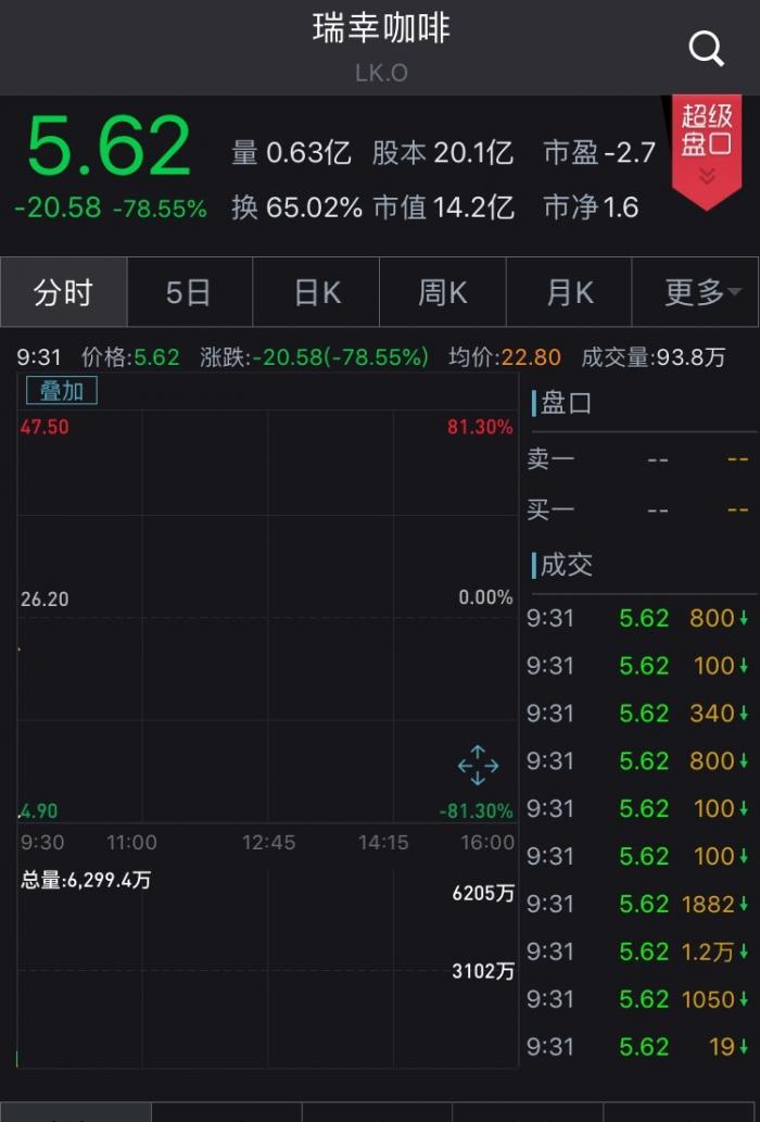 受此事件影響,瑞幸咖啡股價盤前大幅跳水,跌逾80%。開盤不久,瑞幸咖啡便觸發熔斷,熔斷前跌78.55%。