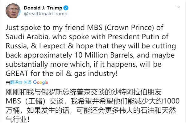 特朗普随后在推特上发文说,减产将“对石油和天然气行业来说是巨大的!” 在定于周五与能源行业高管举行会议之前发表了上述言论。