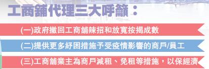 美聯又建議工商舖業主向租戶減租甚至提供多月免租,以讓商戶渡過難關,否則將會加劇商戶的倒閉潮,對本港經濟帶來難以挽救的傷害,屆時市場湧現大量丟空物業,最終對業主也毫無益處。黃漢成又呼籲港府加強紓困,向每家教育中心和美容院等提供8萬元援助,並效法英國政府替企業向受疫情影響而無法工作的員工支付最多八成薪金,惟企業不可解僱有關員工。