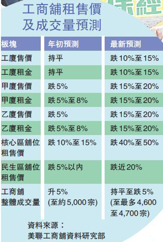 美聯營運總監兼商業部董事翁鴻祥指出,首季指標甲廈售價及租金分別下跌4.2%及8.8%,租金更創金融海嘯後最大的單季跌幅,料甲廈售價及租金預測至下跌約15%至20%。工廈方面,美聯工商董事陳偉志料租售價將跌10%至15%,成交量則持平。