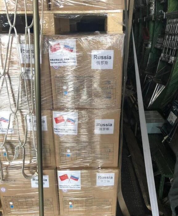 莫斯科时间4月2日4时40分,运载援助货物的俄方货机抵达莫斯科,俄工贸部代表俄政府接收这批物资并送往俄国家外科医疗中心。据中国驻俄罗斯大使馆消息,这批物资总重约25.5吨,其中包括医用口罩、防护服、外科手套、体温计、鞋套等。物资包装箱上用中文和俄文写着“病毒必将被击败,胜利属于我们!”的标语。