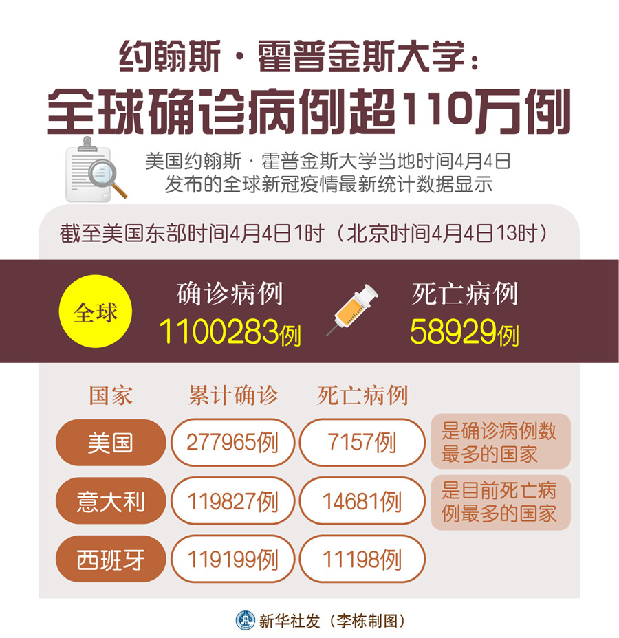 【香港商报网讯】美国约翰斯·霍普金斯大学4日发布的全球新冠疫情最新统计数据显示,全球累计确诊病例数已超过110万例。
