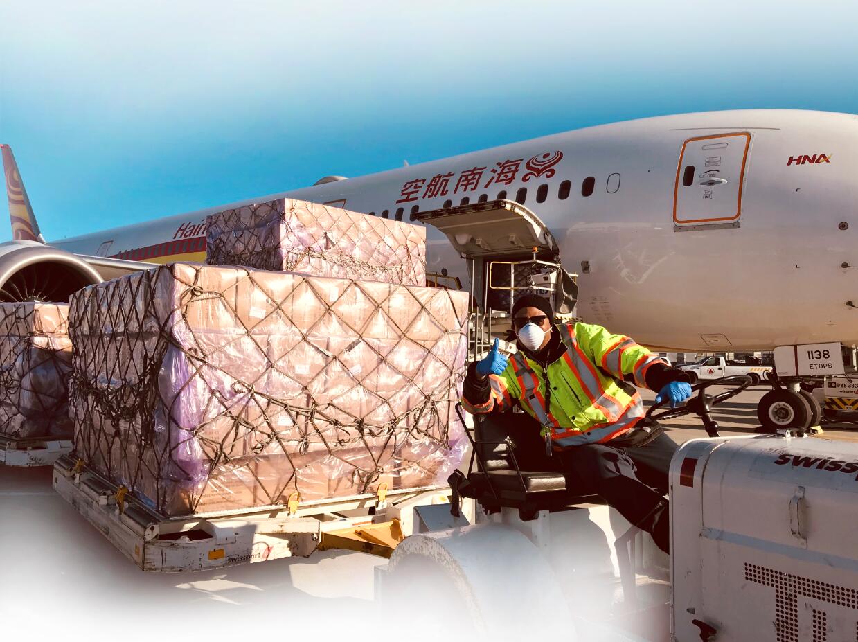 海南航空一架貨運包機近日將 15.67 噸 口罩、防護服及手套等防疫物資從中國運 抵加拿大多倫多。圖為當地機場工作人員 卸下防疫物資。 中新社