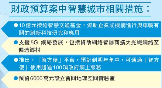最新一份財政預算案中,港府表示將撥款10億元給智慧交通基金,資助與車輛有關的創新科研和應用等,預計基金可在2020/21年度內正式投入運作;以及多管齊下推動5G網絡發展和應用,包括資助網絡營辦商擴大光纖網絡至偏遠鄉村,亦會開放更多合適的政府物業、有蓋巴士站和電話亭等,供營辦商安裝基站,支援5G網絡建設等。