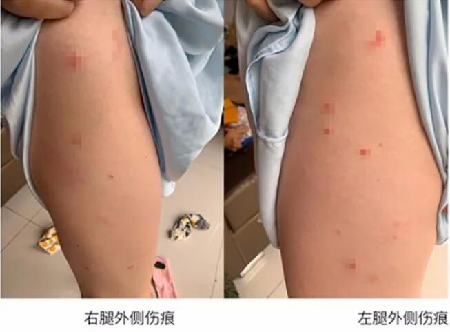 阳娇在举报信后面附上的照片显示,其腿部有多处皮外伤。