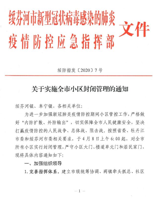 【香港商报网讯】绥芬河市新冠肺炎疫情防控指挥部4月7日发布通知,为进一步加强新冠肺炎疫情防控期间的管控工作,严格做好“内防扩散,外防输入”,位于黑龙江省中俄边境的绥芬河市所有小区自4月8日6时起实行封闭管理,严守小区大门、楼道单元门和居民家门。