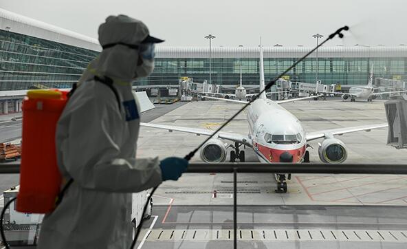 4月3日,消防队员在天河机场航站楼进行消杀作业。新华社