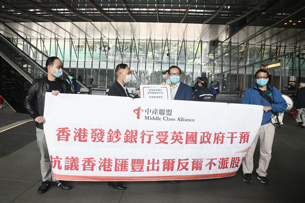「中產聯盟」數名代表昨早到滙豐銀行中環大道中總行請願,並遞交請願信。成員叫喊「抗議滙豐銀行出爾反爾,不派股息」。要求滙豐銀行向市民交代為何會受英國干預,出爾反爾不派股息。同時,需要公開向市民交代股息去向。