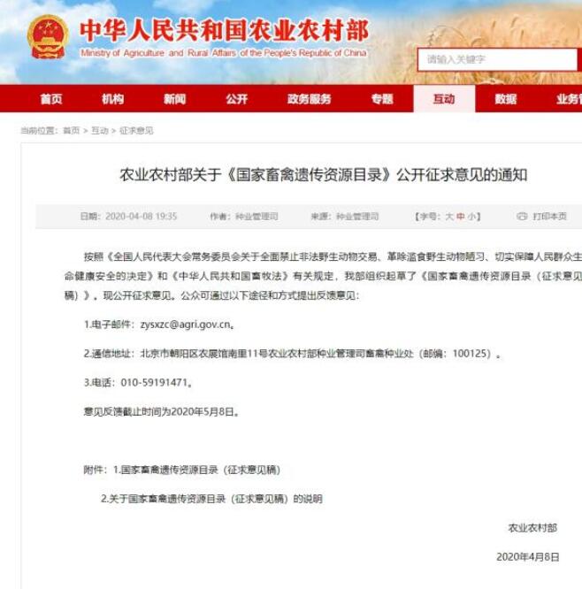 【香港商报网讯】4月8日,农业农村部在其官网公布了《国家畜禽遗传资源目录(征求意见稿)》(简称《目录》)并向社会公开征求意见。《目录》包括家养的传统畜禽和特种畜禽共31个种,列入《目录》的动物,着按照家畜家禽进行管理,可以用于食用等商业利用。