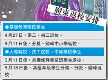 【香港商報网訊】記者李苑立報道:廣東省昨日下午對外公布:經廣東省新冠肺炎疫情防控指揮部研究決定,全省各級各類學校學生自4月27日起分期、分批、錯峰返校。同時明確原定於6月舉行的2020年初中學業水平考試順延至7月份舉行。