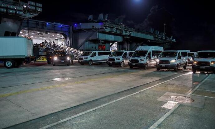 4月7日晚间,美国海军组织车辆将“罗斯福”号航母上的舰员接下船进行隔离。