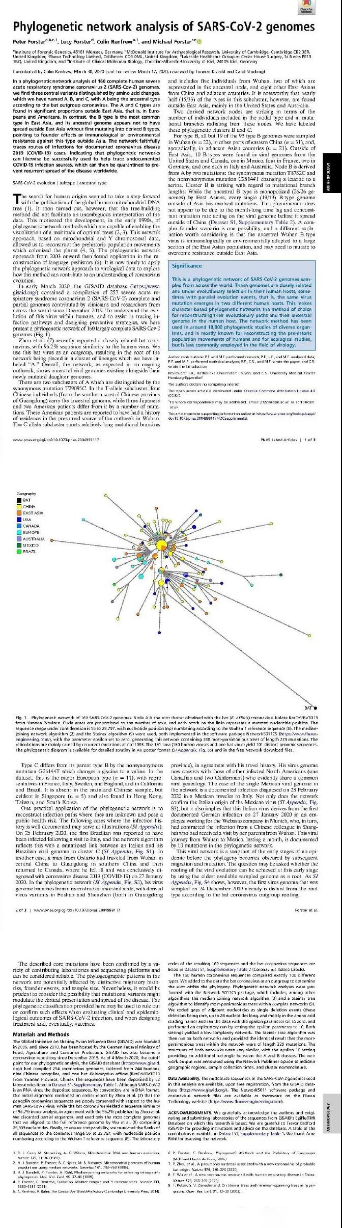 (图片来源:论文《Phylogenetic network analysis of SARS-CoV-2 genomes》)