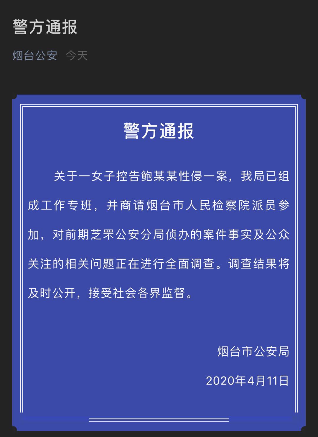 【香港商报网讯】微信号“烟台公安”11日凌晨发布警情通报称,关于一女子控告鲍某某性侵一案,烟台市公安局已组成工作专班,并商请烟台市人民检察院派员参加,对前期芝罘公安分局侦办的案件事实及公众关注的相关问题正在进行全面调查。调查结果将及时公开,接受社会各界监督。