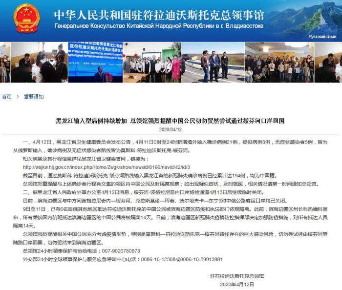 12日,中国驻符拉迪沃斯托克总领事馆网站刊发文章称,黑龙江输入型病例持续增加,总领馆强烈提醒中国公民切勿贸然尝试通过绥芬河口岸回国。