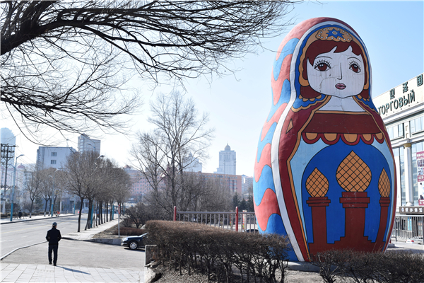 圖為內地邊境小城綏芬河,一位市民走在街上。 路透社
