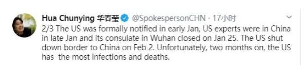 在此之前,华春莹还在推特上提到了中方为美国抗疫提供了援助。“生命第一,没有任何事比生命更重要。中国为美国提供了必要物资,以帮助美国医务工作者获得更好的保护,从危险中拯救更多美国人的生命。”