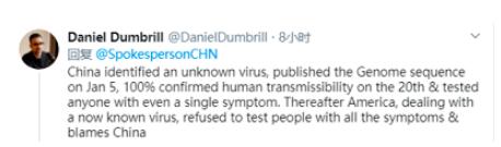 “中国确认了一种未知病毒,并于1月5日发布了(病毒)基因组序列,20日100%确认(病毒)可以人传人,并对任何仅出现单一症状的人进行检测。此后的美国,应对的是一种已知的病毒,拒绝对出现了所有症状的人进行检测,同时指责中国。”