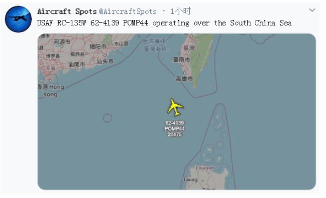 【香港商报网讯】记录军事飞行器动态的社群媒体“飞机守望”4月13日披露称,美国空军的一架编号为62-4139的RC-135W电子侦察机当天在南海海域上空飞行。这是美国军机连续4天现身南海上空。