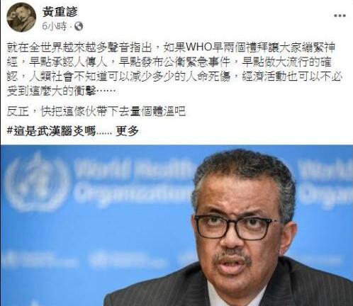 “总统府”发言人黄重谚则在脸书嘲讽,“快把这傢伙(谭德塞)带下去量个体温吧,这是‘武汉脑炎’吗?”发文没多久,黄重谚自己就删了。