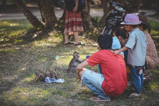 日出结束后,人们便开始参观建筑,也会有像我一样的人,继续留在荷花池边。吴哥窟的猴子们胆子很大,也很有“眼力”,一点没骚扰游客们观景,等到人群开始散去,便出来活动,跟游客们要吃要喝,或者自顾自地玩。确实,和它们相比起来,我们才是这片土地上的客人。