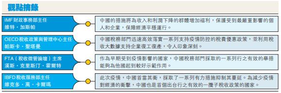 IMF(國際貨幣基金組織)財政事務部主任維特‧加斯帕認為,中國政府正在加快支付失業保險金並擴大社會安全網,減輕最脆弱地區和部門的企業稅收負擔,其中包括交通、旅遊和酒店行業,對現金短缺的企業實行延期繳稅政策,允許企業暫停支付社會保障繳款。這些措施將為收入和利潤下降的群體增加福利,保護受到最嚴重影響的個人和企業,保障經濟平穩運行。