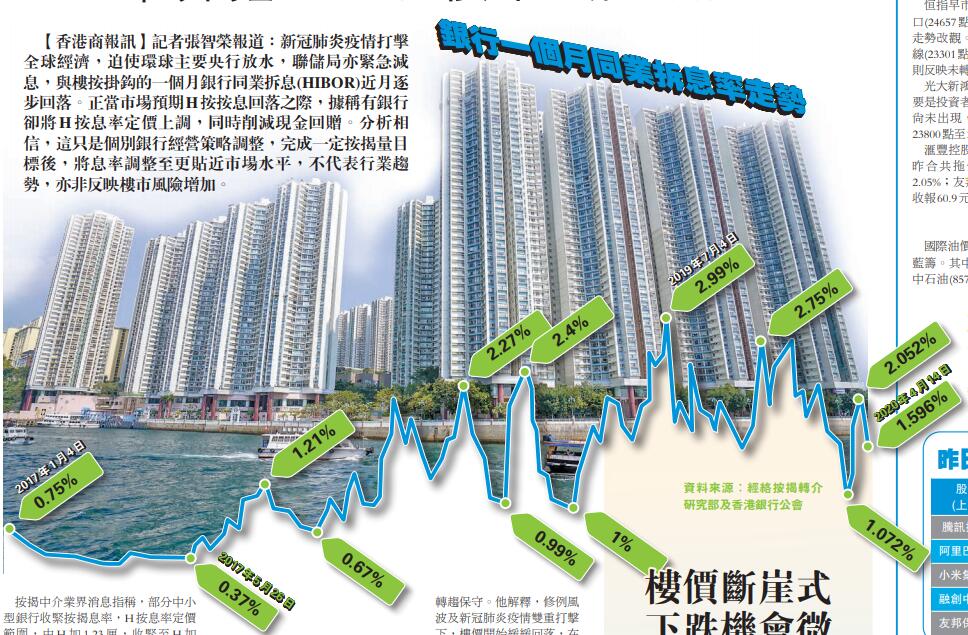 【香港商報网訊】記者張智榮報道:新冠肺炎疫情打擊全球經濟,迫使環球主要央行放水,聯儲局亦緊急減息,與樓按掛的一個月銀行同業拆息(HIBOR)近月逐步回落。正當市場預期H按按息回落之際,據稱有銀行卻將H按息率定價上調,同時削減現金回贈。分析相信,這只是個別銀行經營策略調整,完成一定按揭量目標後,將息率調整至更貼近市場水平,不代表行業趨勢,亦非反映樓市風險增加。