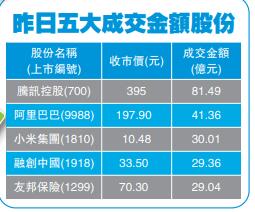 滙豐控股(005)、友邦保險(1299)及中國移動(941)昨合共拖低恒指119點。控收報40.6元,跌2.05%;友邦保險收報70.3元,跌2.23%;中國移動收報60.9元,跌1.77%。